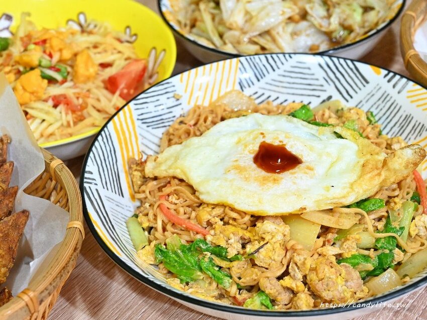 泰小葉泰式風味小食這次將泰式炒泡麵升級成泰式炒泡麵2.0,將泡麵加入白菜、洋蔥、豬腳肉及老闆娘特製醬料下去爆炒入味,麵條Q彈不過爛,帶點微辣風味,上頭還附上一顆半熟蛋唷