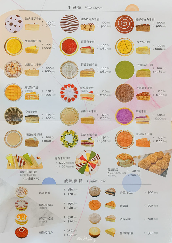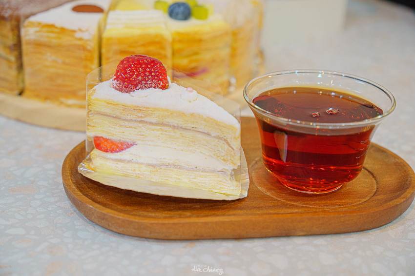 每天店內都會推出限定6種口味,每周都能吃到不同口味的千層蛋糕,本周推出的是『法式香草千層、酸甜檸檬千層、芋頭清香千層、季節限定的鮮草莓千層、綜合水果千層、濃郁巧克力千層』,如果千層蛋糕想要吃到整顆的都是需要提前2天預訂的唷。