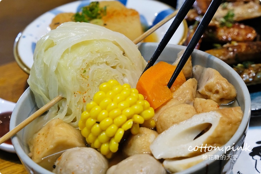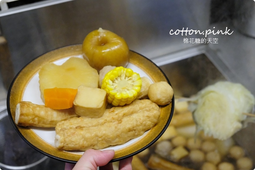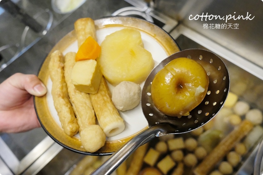 眼尖的你看到了嗎?裡面竟然有一整顆的蘋果出現在關東煮裡!阿季原本還以為這只是用來熬湯頭的配料而已~沒想到竟然就直接被端上桌了,重點是還很好吃耶!酸酸甜甜的蘋果吸附了柴魚湯頭~味道完全不違和,大家一定要試試看!