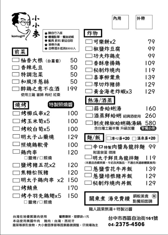 台中宵夜這家超反差~舊汽車修配廠改裝成為日式居酒屋,大大的布簾加上冉冉升起的熱氣讓人瞬間有來到日本屋台的錯覺!小小麥國美館距離草悟道不會太遠~就在文化中心、美術館旁邊唷!店裡最新菜單關東煮、剝皮辣椒雞湯熱情供應中!串燒、烏龍麵、關東煮、鍋物一次擁有就來小小麥國美店啦~