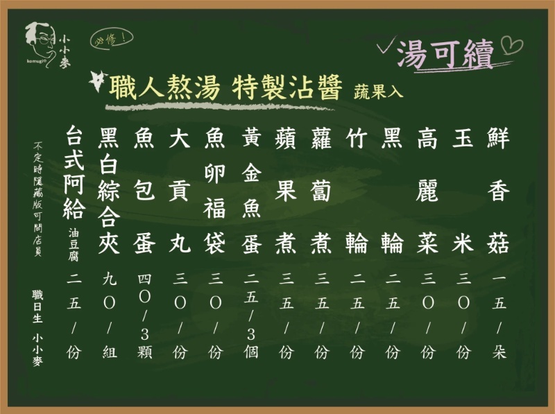 冷冷的冬天來臨~快來小小麥溫暖一下!這次重新回歸~小小麥就帶著最新的關東煮來暖和大家的胃,這樣一鍋好料在吧台飄散著熱熱的白煙~冬天的夜裡看了就覺得好舒服!