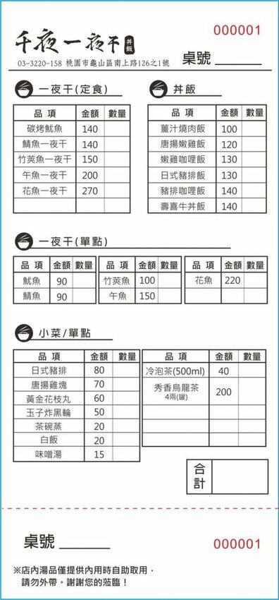 菜單有一夜干定食、丼飯和小菜單點,一夜干不夠吃也有單點,一尾90元到220元之間,最便宜的薑汁燒肉飯才100元,點定食或丼飯內用可享自助區吃到飽。