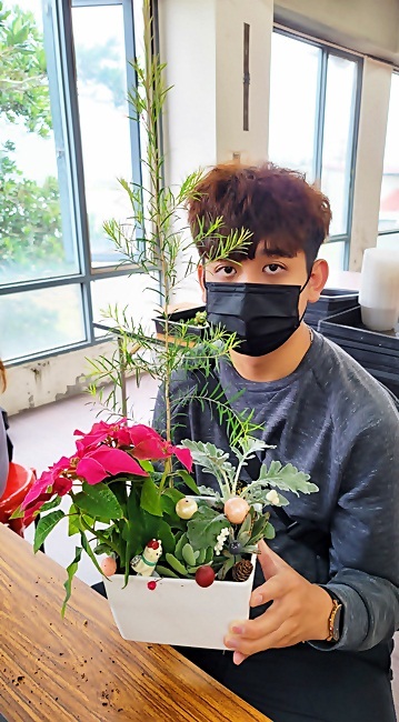 花卉DIY材料有澳洲茶樹、聖誕紅、粉紅公主、銀葉菊、盆子、防蟲網、多肉植物、聖誕配件、松果、公仔等,再過還有花插,這就是讓你帶回去後,在種植上有任何問題都有資訊可以詢問、超貼心。