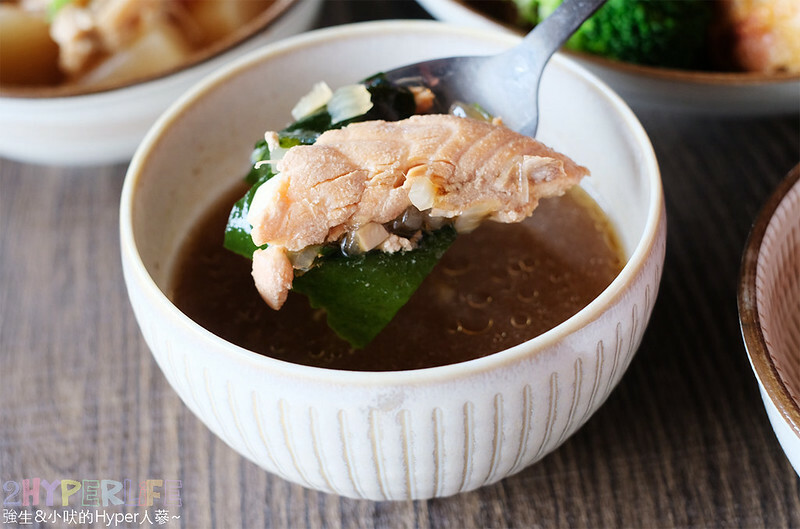 套餐附的味噌湯裡面除了洋蔥、豆腐、海帶還有鮭魚肉,味道剛好不會過鹹,使用有帶刺的魚肉要小心食用喔~