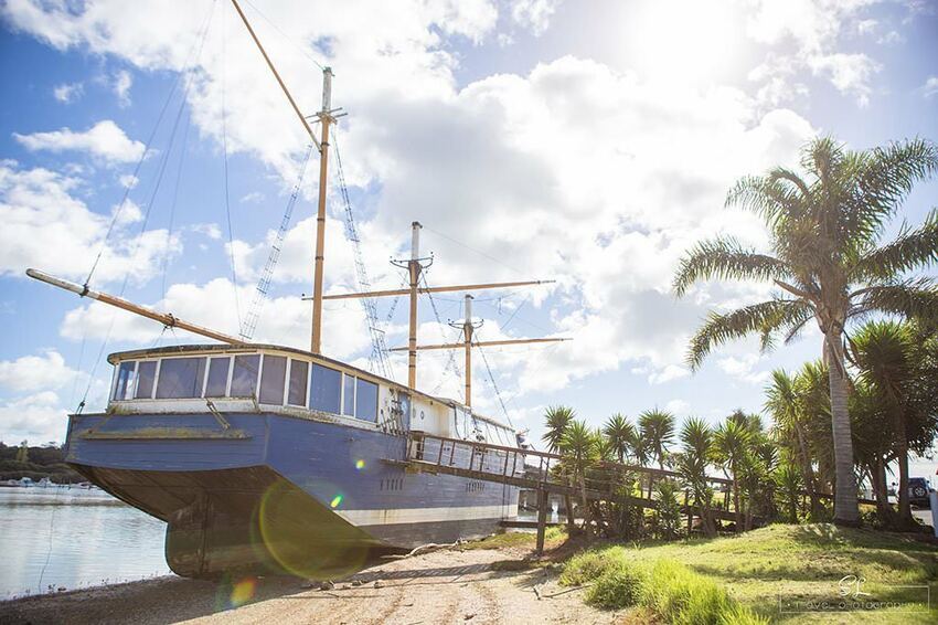雖然派希亞 Paihia 小鎮沒有很大,對我來說卻是紐西蘭北島 New Zealand North Island 的祕境之處。除了夏季湧進大量的民眾來這玩水之外,其實附近也有一些毛利人相關的歷史可以讓各位參與當地的導覽一起旅行。今天的天氣晴朗少雲,要參加任何活動的話還是得好好防曬。然而昨晚住在靠近派希亞 Paihia 海邊的 Waitangi Holiday Park 的小木屋裡,從住宿走出來就看到這樣一艘老舊的船。