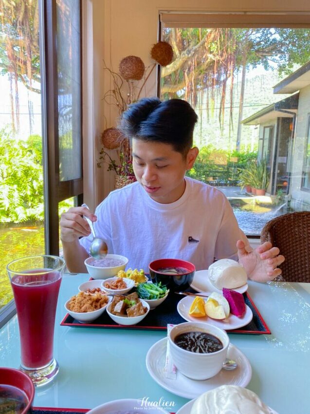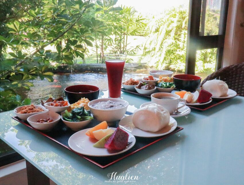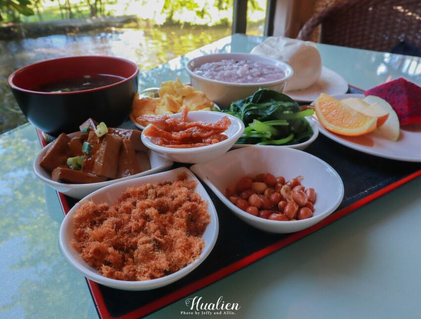 早餐可以說是Jeffy每次到外面住宿最期待的環節啦~金澤居民宿提供一人一組的中式餐點,除了主食稀飯與饅頭外,還有六樣配菜(肉鬆、豆棗、花生、豆干、炒蛋與青菜),並隨餐附上水果盤,讓人看得口水直流!飲料可選擇紅茶、綠茶、豆漿、咖啡或果汁,實在太豐盛啦,而且這樣多元的中式早餐,帶長輩來肯定也會大受好評呢?