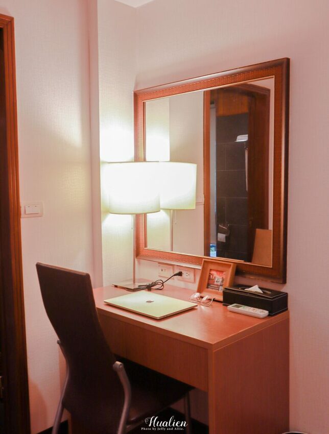 房間裡頭乾淨整齊,木質地板與暖黃柔和的燈光,給人一種終於回到家的感覺。空間十分寬敞,擺下一張雙人床後,走道的空間還很餘裕。房間的另一端還有桌椅可以坐下休息看電視。為了即時記錄下我們的住宿感受,我們也帶了電腦在電腦桌上工作了一陣子。