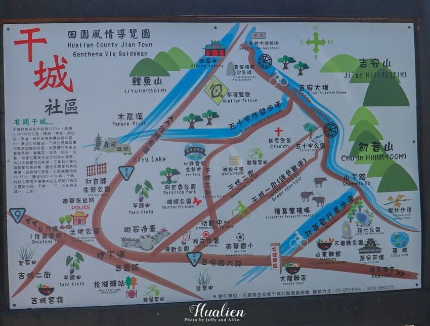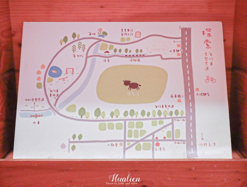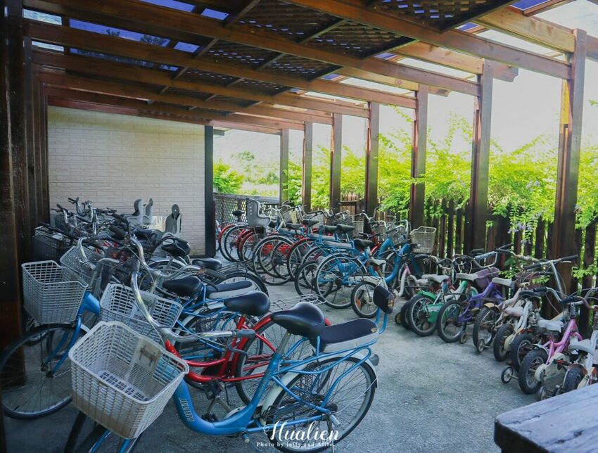 在樹窩餐廳後方有一處遮雨棚,這邊停放了許多腳踏車,提供免費的腳踏車租借,建議可以搭配民宿提供的腳踏車地圖。老闆也推薦我們附近幾個在地人精選景點,我們果斷放棄花蓮剩餘的行程,準備騎單車慢遊山水田野間,深入探索純樸的干城社區。