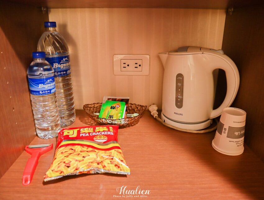 房內設施齊全,除了常見的熱水壺、茶包、礦泉水外(竟然是大瓶的),還附有我們從小吃到大的可樂果以及迎賓蘋果,也貼心地附上了削皮器,各個小巧思都讓我們好驚喜。