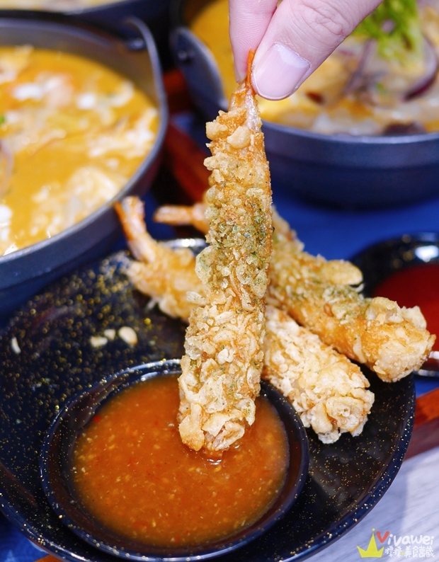 ▲天婦羅炸蝦外層裹上薄薄一層麵包粉,外層炸衣酥脆,蝦子口感也很紮實!一旁的沾醬是加了蒜頭、魚露與檸檬汁特製的椒麻醬!將天婦羅炸蝦沾上椒麻醬汁~這樣的鹹香滋味很迷人~不吃不行啊👍