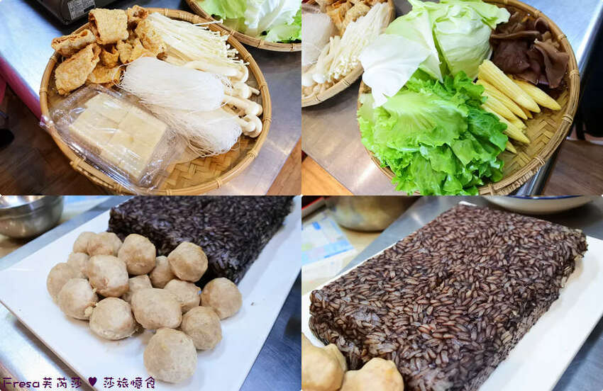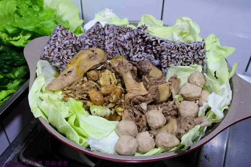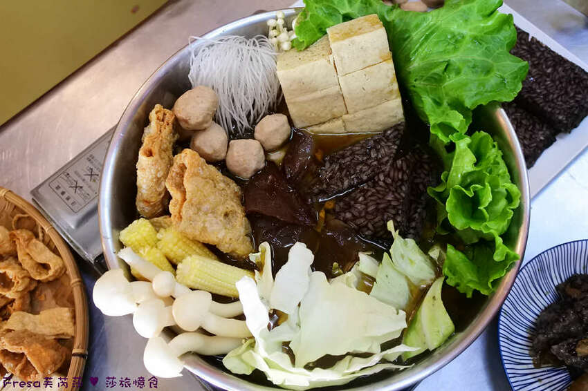 除了各樣滿滿的蔬菜,再放上自製鵝肉丸+手工鴨米血.
