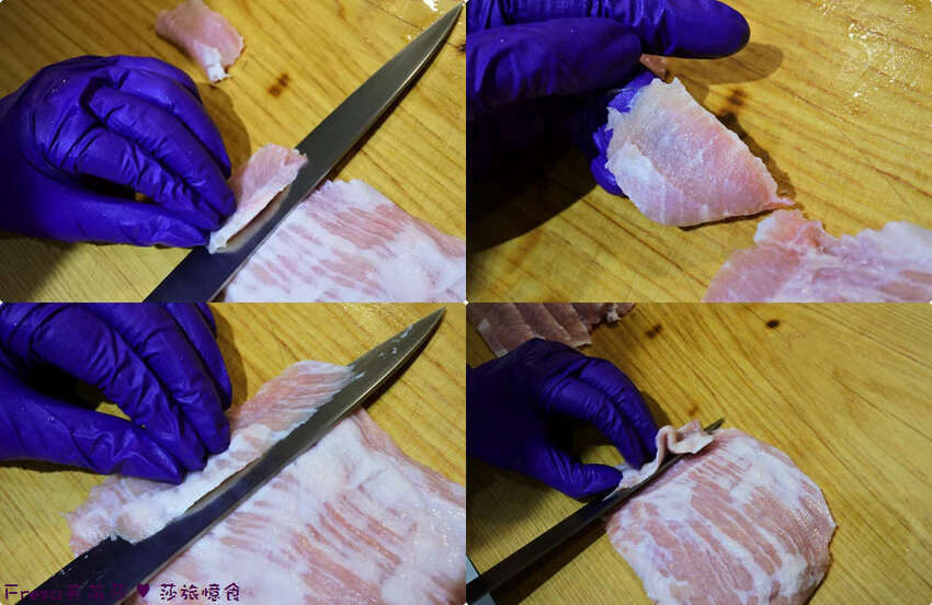 現場看著店員刀起刀落,迅速將一片片多餘油脂筋膜切除.