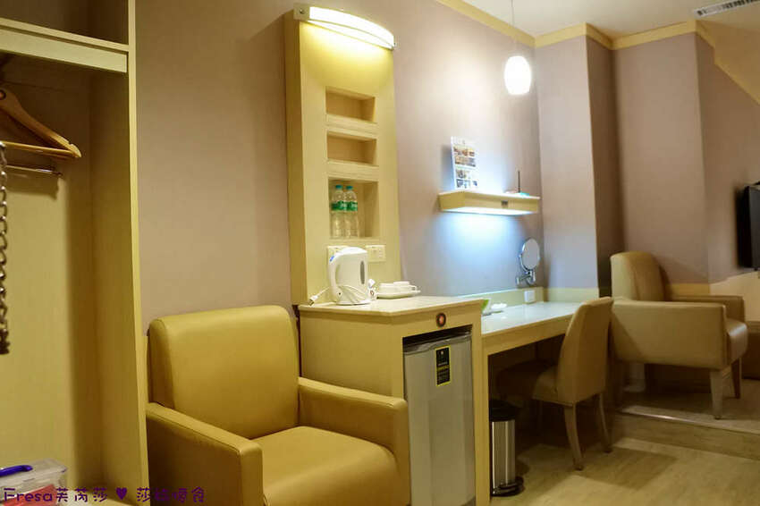 進門左手邊是開放式衣櫃、單人沙發、迷你吧、商務桌.