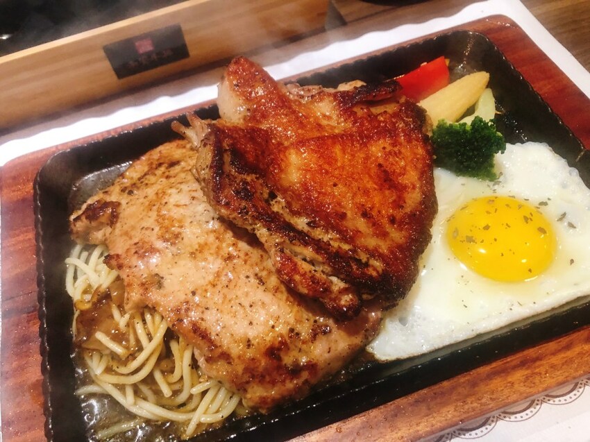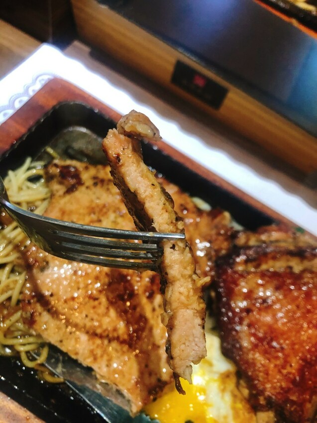 原以為雙拼會是使用兩塊較小的肉,沒想到卻是超大兩塊,完全把鐵盤沾滿了,雞排使用紹興酒醃製,其實沒吃出酒味,外皮煎的脆脆的,雞肉非常軟嫩且不柴,豬排感覺裹了薄薄的粉,口感也是非常的嫩,完全沒有腥味,這點非常可以。