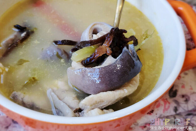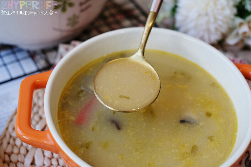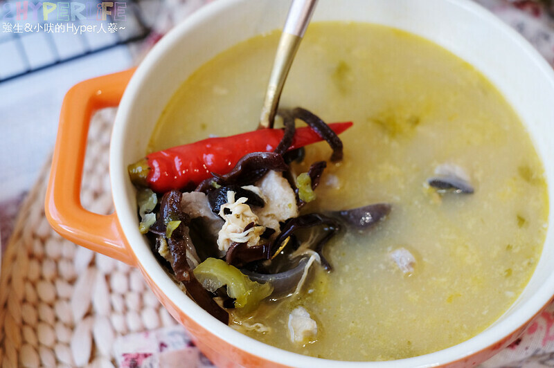 同樣以老母雞高湯作為基底,喝起來是酸酸辣辣的風味,而且為了增加湯頭中酸味的豐富度,盼蒔加入自家醃製的蘿蔔、酸菜、酸豆角、泡椒以及還有西式酸豆入湯這個很特別!