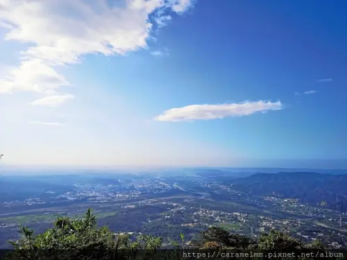除了小橘人外,登上三角點後,也能看到傳聞中新竹百萬夜景的180度展望視野,真的非常的開闊;在這休息期間,也不斷看到機車騎士從旁邊的產業道路上來,能想像到晚上的涼亭,也是個大熱點。