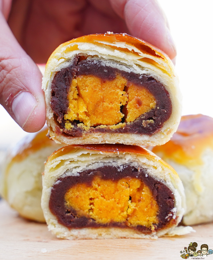 中間夾層綿密香甜的紅豆,讓整個蛋黃鹹香與紅豆甜味很融合