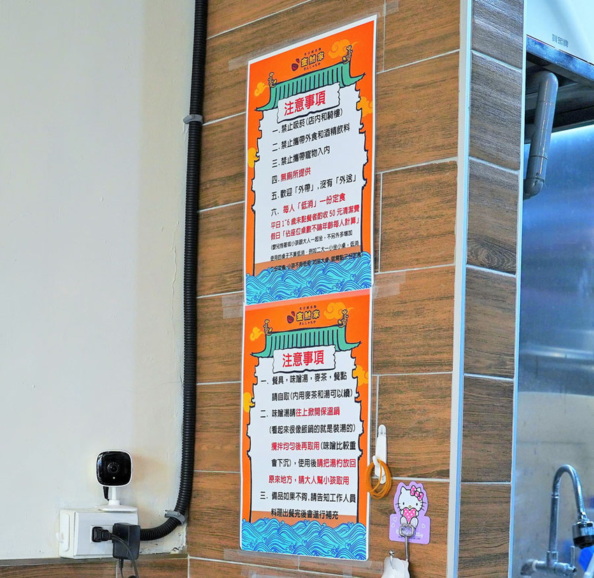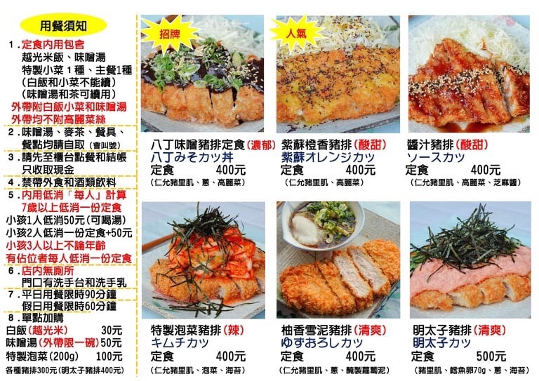 不能帶寵物和酒精飲料、每人一份定食低消、店鋪內無廁所