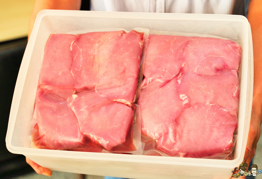 老闆很可愛,趁空閒的時候還把真空包裝的溫體豬肉拿出來給我們看
