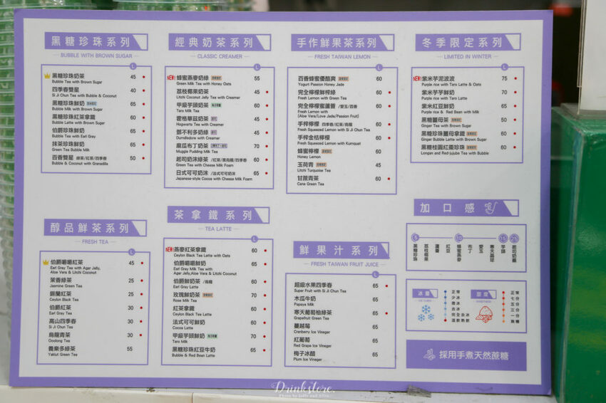 水雲朵Drinkstore飲料主要有黑糖珍珠系列、經典奶茶系列、茶拿鐵系列、純品鮮茶系列、手作鮮果茶系列以及鮮果汁系列,冷冷的冬天裡,想來杯熱飲也可選擇紫米或黑糖等冬天系列。Jeffy覺得最特別的是他們家的加料,除了一般常見的珍珠與椰果外,也能加上蜂蜜燕麥或芋頭,甚至還能做成起司奶蓋,讓飲料有了更多元的變化!