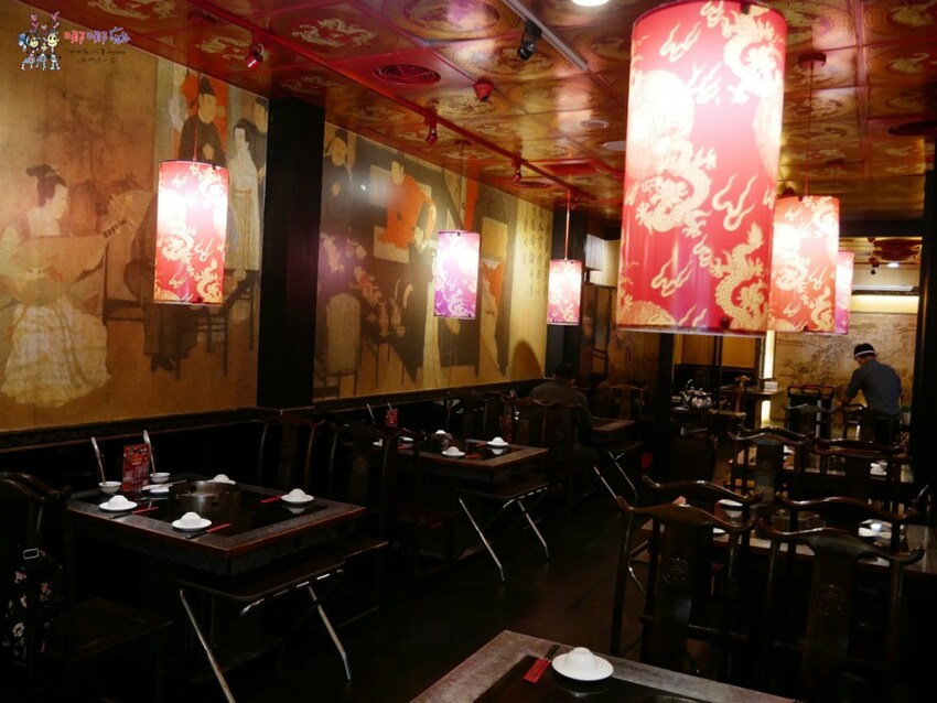 二樓的座位看起來比一樓還要多,也一樣裝飾的非常中國風,頗有在古代大戶人家吃飯的感覺。中間的屏風裝飾的是雍正十二妃的其中幾張圖,整體色系以紅色和金色為主看起來華麗但又不會感覺太過花俏。