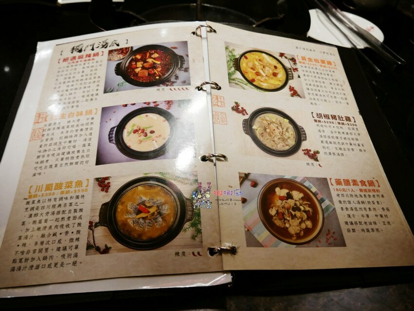 我們今天選的是二人老饕宴,鴛鴦鍋可以選兩種湯頭,老四川總共有六種湯底,除了辣鍋和白鍋是不用另外加錢的基本鍋底,其他則是需要另外加價的藥膳養生鍋底。