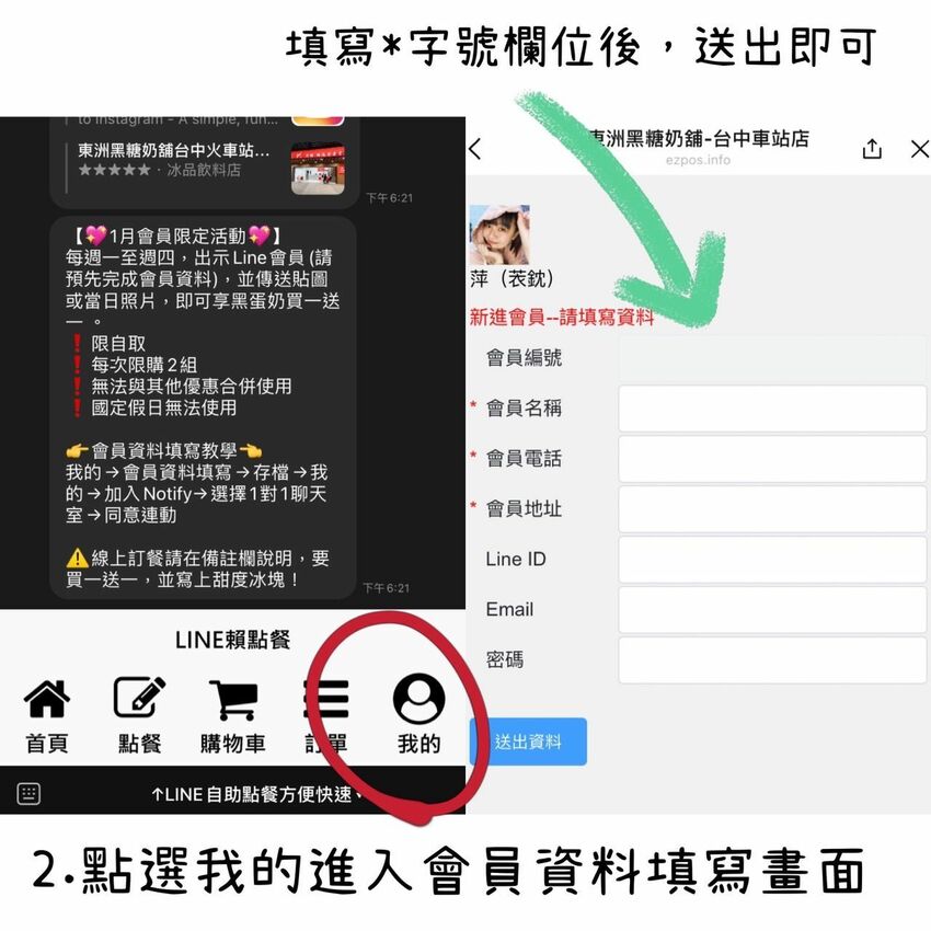 活動辦法:來店出示Line會員(請預先完成會員資料),並傳送貼圖或當日照片,即可享黑蛋奶買一送一 。