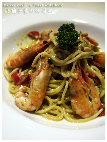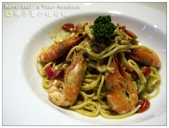 松子鮮蝦義大利麵 (青醬) (NT$220)