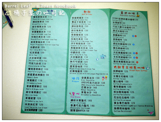 接著背面是飲品的部份,分成~冷飲、熱飲、冰沙、聖代、美式咖啡、現煮咖啡,