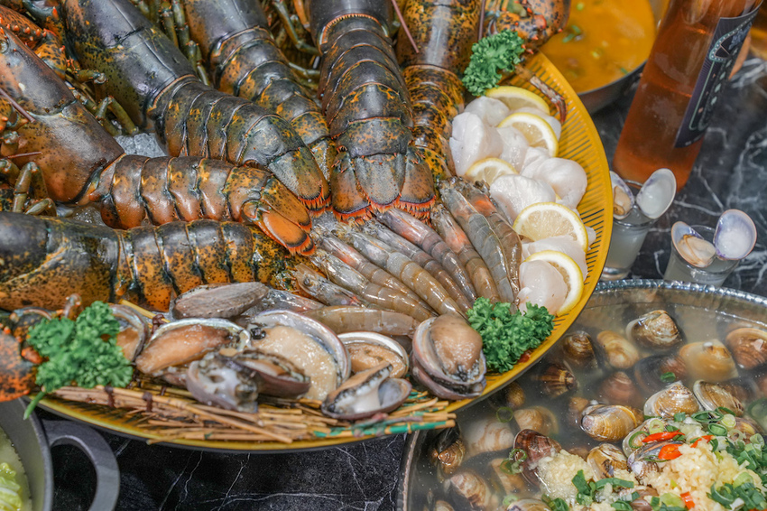 「巨蛤宴」的海鮮拼盤也是一大亮點,除了剛剛有提到的文蛤12斤外,還有六隻活鮮波士頓龍蝦、牛奶貝、生食級干貝、活鮮鮑魚和台灣現流白蝦,這盤一上桌大家都驚呼連連,這食材真的給的完全不手軟,是海鮮控們的福音無誤!