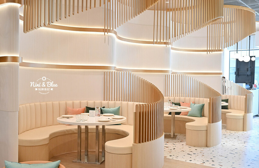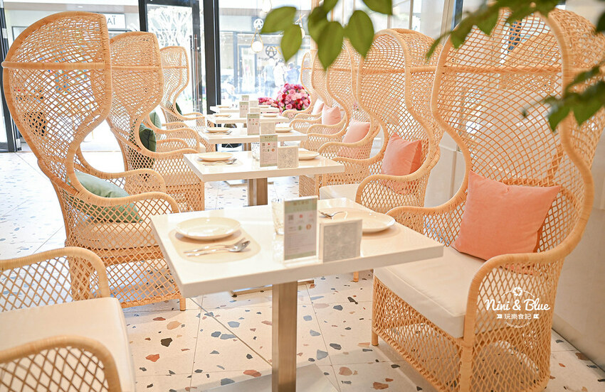 店內風格以大自然花園般的舒適慵懶風為主軸,大量運用米、白、粉溫柔色調,讓人感覺舒適放鬆