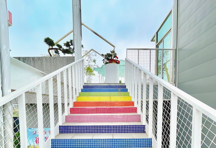 另一邊的彩虹階梯也很好拍,每個階梯漆上七彩顏色,由下往上拍可以有漸層色調的感覺;在階梯拍照有個重點:伸出你的長腿,看起來會更修長哦。我們全家在這個彩虹階梯停了半小時都在拍照,網美照、搞笑照都拍,愛拍照的朋友很推薦你來這裡,超能殺時間。