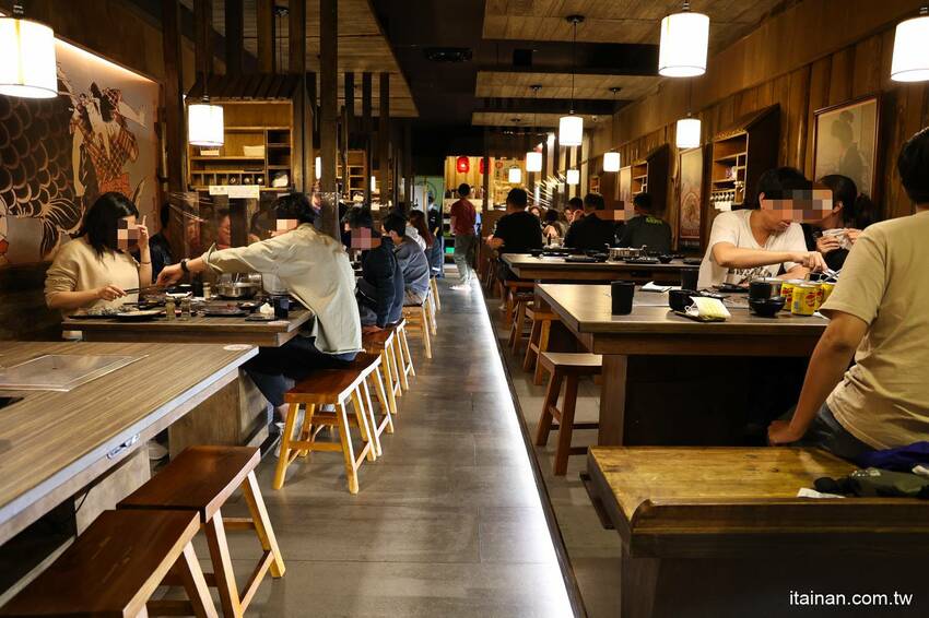 店內用餐桌位不多,尖峰時段容易客滿,建議先預訂位比較不用等待,用餐桌採內崁式的烤肉爐,木炭直火烤炙,長方形的烤盤面積較大,而且採下吸式抽風,烤肉時不會有煙霧瀰漫的感覺,吃完燒肉也不會身上都是燒烤味。火鍋則是採用電磁爐,帶小孩來用餐也相對安心。