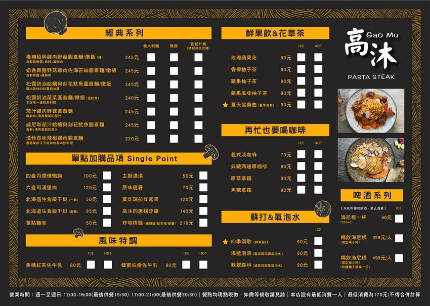 翻開高沐的MENU,超級大一張品項密密麻麻,總的來說有義大利麵跟燉飯兩種選擇,但各別又有紅白青醬,還有特製的橘醬,主餐上也有牛排、海鮮、豬排等等,而且份量絕對不小氣,想吃得更滿足也能選擇加價升級雙主餐,