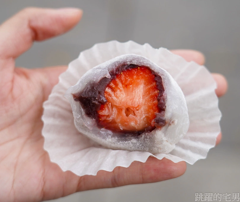 草莓大福一顆45元,他們賣2顆或是6入裝,真的不得不說他們用得草莓大顆又甜ㄟ,我看它們FB介紹麥造烘焙草莓用大湖草莓的2號草莓,吃起來鮮嫩多汁又甜,品質很好,然後她的皮的口感好好喔,這個皮不像是一般麻糬口感,彈性很棒,尤其搭配不太甜的紅豆餡更是好吃,這時候就是要吃草莓大福啦,這家草莓大福推!