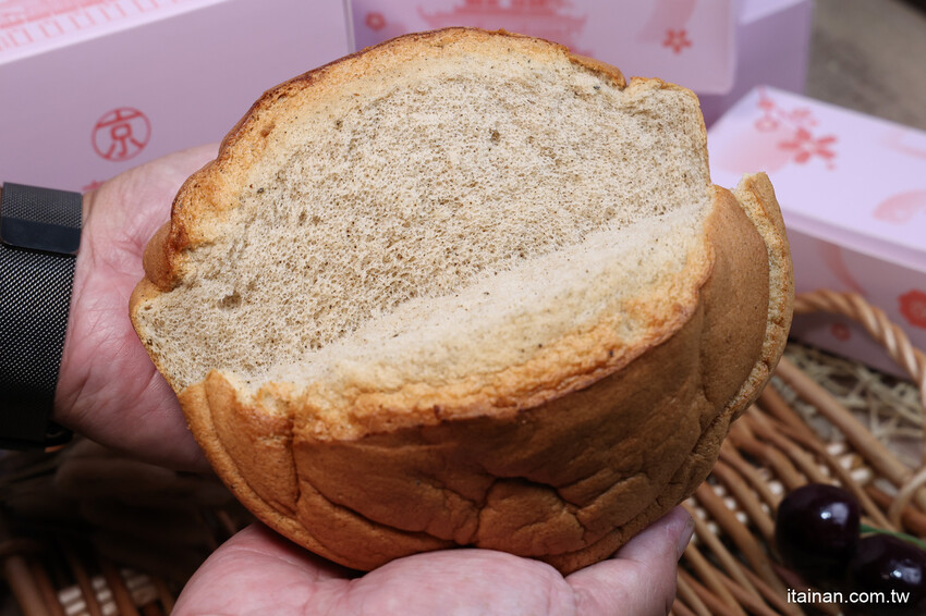 手撕蛋糕的包裝盒是粉嫩的粉紅色,仔細看盒子上還打印上赤崁樓的圖案,很適合作為伴手禮。