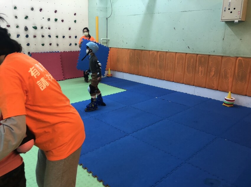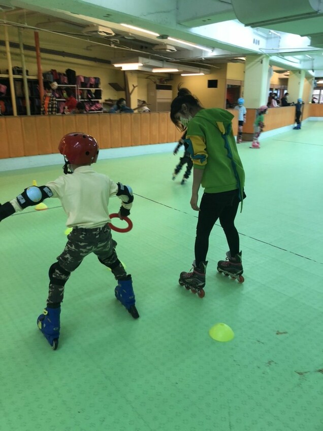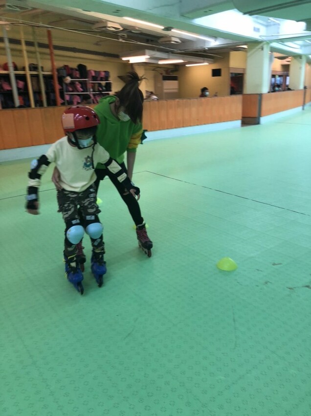 剛開始學習直排輪會不斷的摔倒,從每一次的摔倒中才能學到平衡感以及找到全身肌肉的穩定性,相當重要!課程場地的四周都有有家長陪伴區,給人一種安心感~
