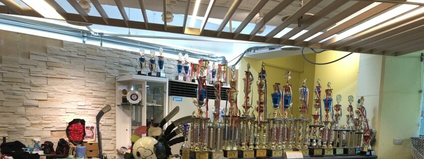 一入櫃台,台上擺滿各式獎盃獎座,這邊也是教練休憩處所