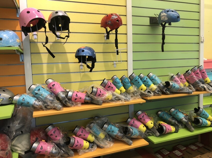 環球兒童運動學院也提供各式尺寸直排輪與相關護具供購買,學員因腳長大購買直排輪,舊換舊免費,舊換新五折