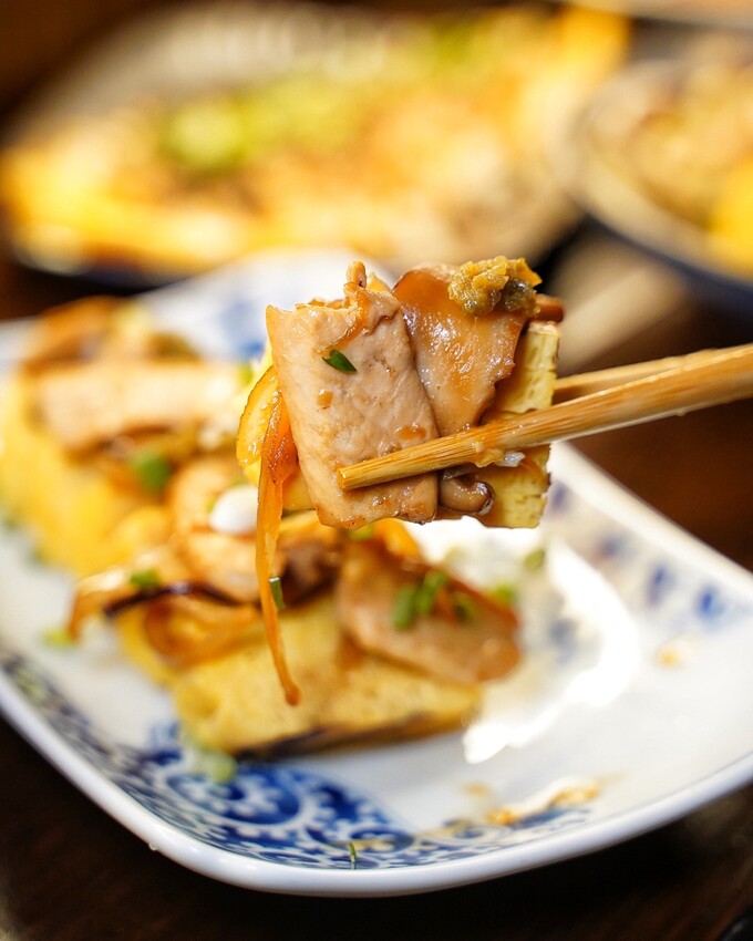 金黃色的蛋液包入豬耳朵及起司,很特別是加入花生粉來提香,起鍋後擠上美乃滋炙燒,再撒上柴魚片、海苔絲、蔥花及七味粉,是一道骨子裡是台灣風味,外表非常日式的特色料理!
