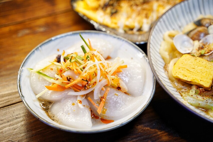 「麻辣乾拌水晶餃」使用苗栗老牌「江技舊記」的水晶餃,淋上芝麻醬、蒜頭、辣油調味,放上洋蔥、紅蘿蔔絲及小黃瓜絲點綴,麻醬口味的濃郁芝麻香氣搭Q彈有嚼勁的水晶餃,是一道很不錯的開胃菜。