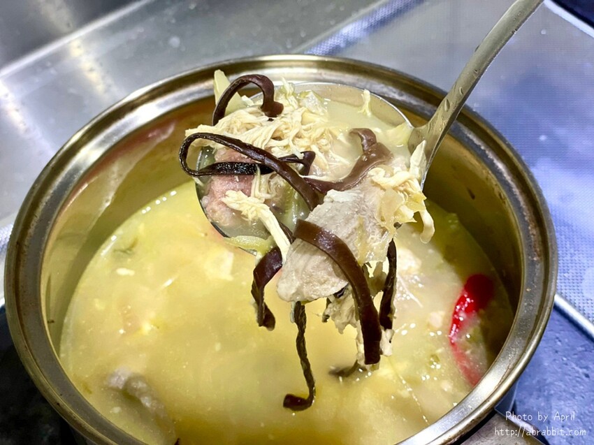 這款口味比較重一些的泡椒酸湯魚,一樣是以老母雞高湯作為基底,加入店家自己醃製的蘿蔔、酸菜、酸豆角、泡椒,裡頭有口感軟嫩而不柴的魚片和清爽脆口的木耳絲,還有一些薑絲提味,整碗湯頭喝起來小辣而不嗆喉,我覺得算是一款蠻重口味卻又讓人欲罷不能的湯,第一口可能會覺得有些辣,但喝完之後卻又可以接著繼續第二口,大概就是這款湯的魅力了!