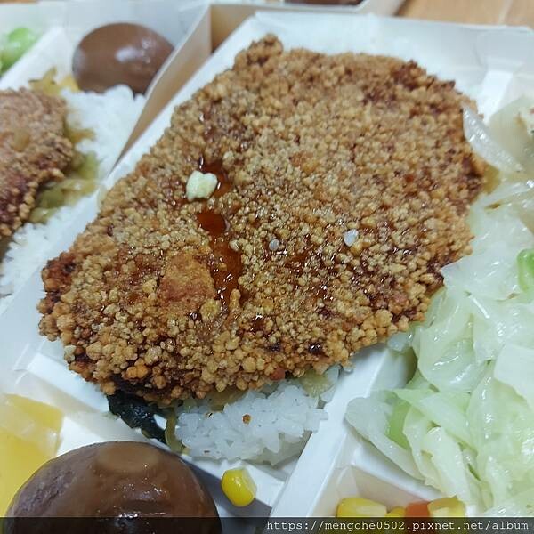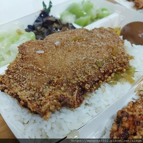 我們四個人總共點了三個排骨便當,便當裡面有三種配菜滷蛋還有酸菜算是比較古早味的搭配,而我是單點的排骨而已,因為等一下還要吃別的東西,他們家的排骨吃完真的覺得很可以,吃起來就是有醃過再裹粉下去炸的滋味。