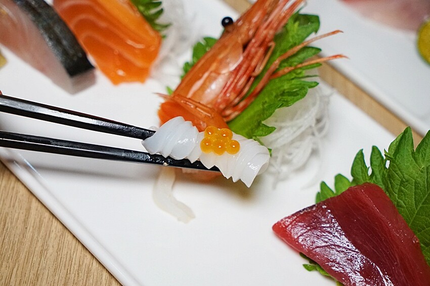 紋甲花枝切粗段捲起來,上面以鮭魚卵點綴,輕輕夾起一口入嘴,感受到花枝的Q與鮭魚軟帶來的海味,咀嚼間讓紋甲花枝的甜味更是明顯。右側的鮪魚入口那香滑清甜的魚肉厚實,舌尖每一處都能充分感受到柔軟的肉質呢~