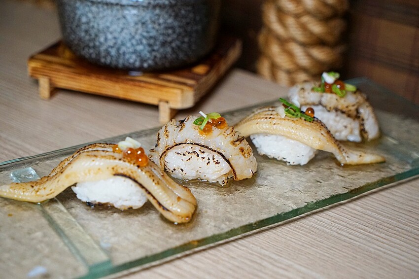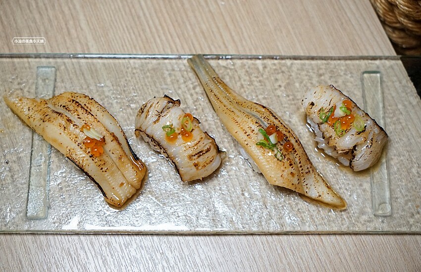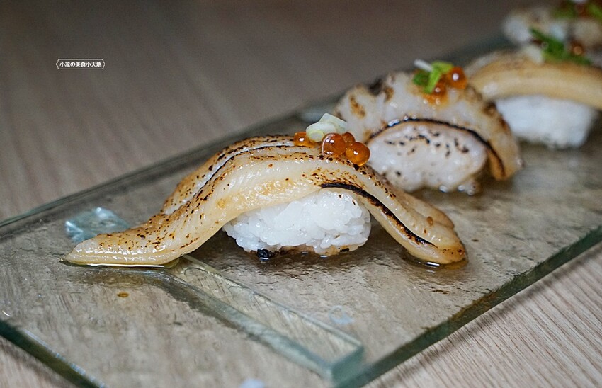 炙燒星鰻握壽司,建議這時候別去管氣質的問題,一定要大口入嘴,才能感受到魚肉的軟嫩在炙燒後,油脂特別香,加上星鰻肉質細緻,還有那微微的勾舌甜味與米飯間的融合之味~