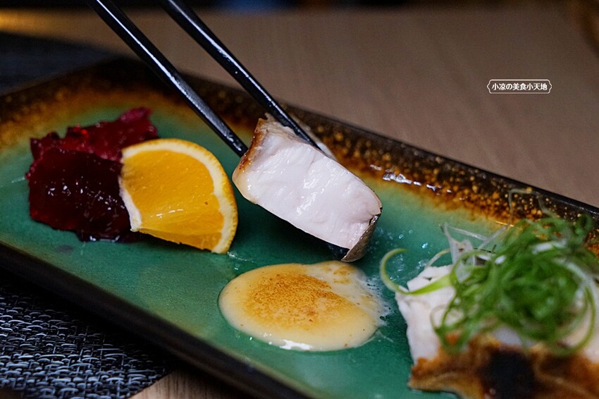 日本鰆魚在烤過後有著獨特的香氣,吃起來有一種細膩、柔軟的口感,加上油脂散發清香味兒很具獨特,再搭上些許火龍果醋凍挺清爽。