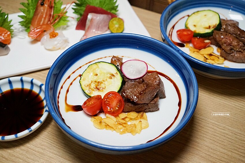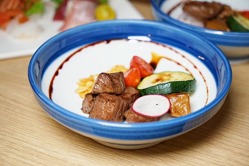 香煎翼板牛吃起來有濃厚的肉感與醬香,加上瘦肉中帶有微微油脂吃起來的口感不柴不膩搭上香脆的蒜片更是美味不已,吃了肉也要來點時蔬櫛瓜、杏鮑菇搭配更是豐富的這道強餚。