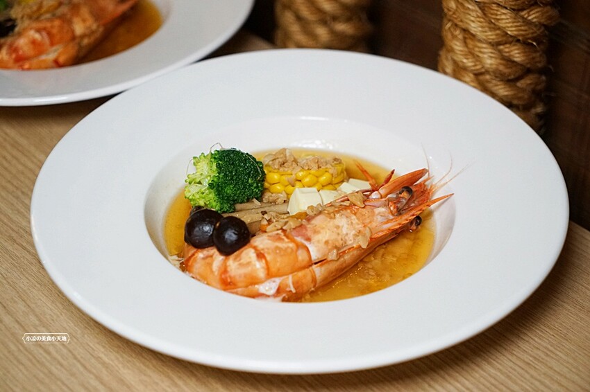 這道蒸物的湯頭是麻油+高湯+蒜與海大蝦、時蔬一起下去蒸熟,湯喝起來帶點麻油的香氣不厚重,湯頭有著蝦與時蔬的甜味,是可以喝光光的湯底唷!!