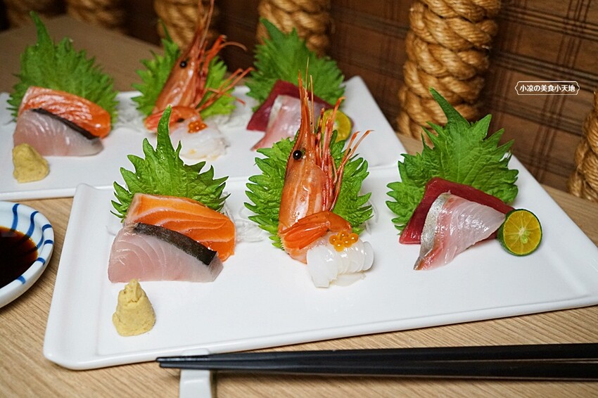 鰆沐 割烹·酒,店內是以日本無菜單料理,所以每日供應的漁貨會有所不同唷!!小涼這天的生魚片是鮭魚、日本鰆魚、牡丹蝦、 紋甲花枝、鮪魚、日本白魽(接近肚子部位) ,建議以顏色最淡的開始吃唷!!小凉的建議是紋甲花枝、日本白魽、日本鰆魚、日本牡丹蝦、日本鮭魚以及鮪魚。