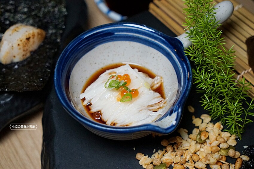 炙燒海苔干貝是道很具創意的吃法,將海苔與炙燒過的北海道生食級大干貝一起包裹著吃,感受海苔的鮮與干貝的嫩Q口感,咀嚼間還可以加上一旁的穀物脆片一起吃,頓時讓嘴巴內的口感變得相當豐富呢